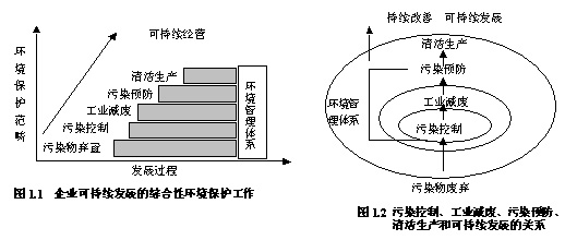 因此,企业建立一套完整的环境管理体系,强调高层承诺及全员参与,及污染预防与持续改进,并将工业减废、污染预防及清洁生产等理念及相关技术建立于体系中;让员工在研发、制造、加工及操作上养成习惯,无形中融入企业经营文化,以提高公司环境绩效及公司形象,达到企业可持续经营的目标,如图1.1所示。其中传统污染控制、工业减废、污染预防及清洁生产关系如图1.2所示,就范围大小来比较污染控制、污染预防、清洁生产和持续发展等的差异。图中显示如果仅就制造过程的污染进行处理,则称为“污染控制”;将改善制造过程及原料、资源的回收再利用,则称为“污染预防”;再考虑产品生命周期的各个阶段,并将服务阶段的各种可能减少污染的方法纳入其中,则称为“清洁生产”;这些环境管理的手段,最终的目的都是为了范畴更广的“可持续发展”。图中有一重要的观念是范围较大的管理方式包含范围较小的方式。